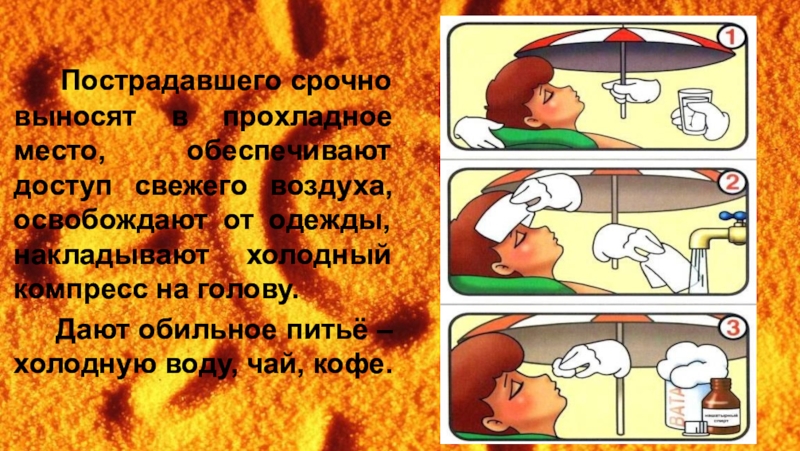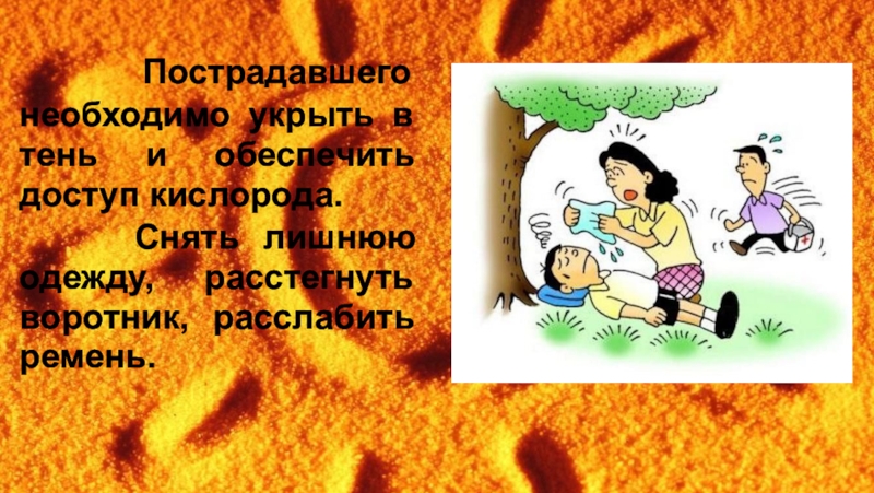 Слайд 6 Пострадавшего необходимо укрыть в тень и обеспечить доступ