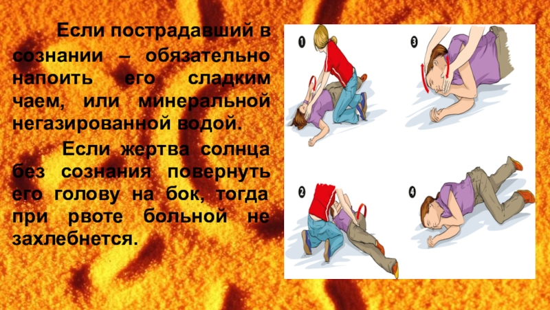 Если жертва солнца без сознания повернуть его голову на бок, тогда при рвоте больной не захлебнется.