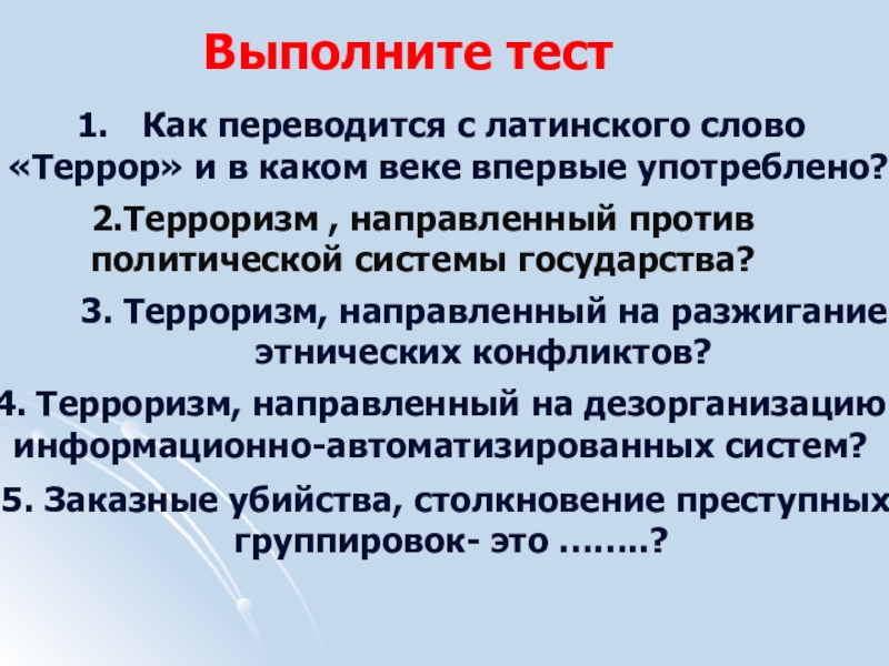 Выполните тест    Как переводится с латинского слово «Террор» и в каком веке впервые употреблено?2.Терроризм