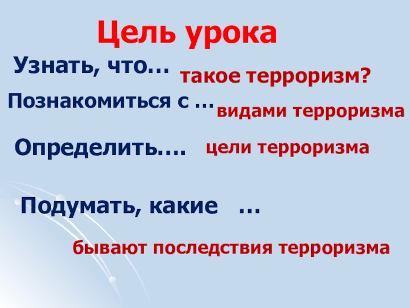 Цель урокаУзнать, что…Познакомиться с …Определить….Подумать, какие  …такое терроризм?видами терроризмацели терроризмабывают последствия терроризма