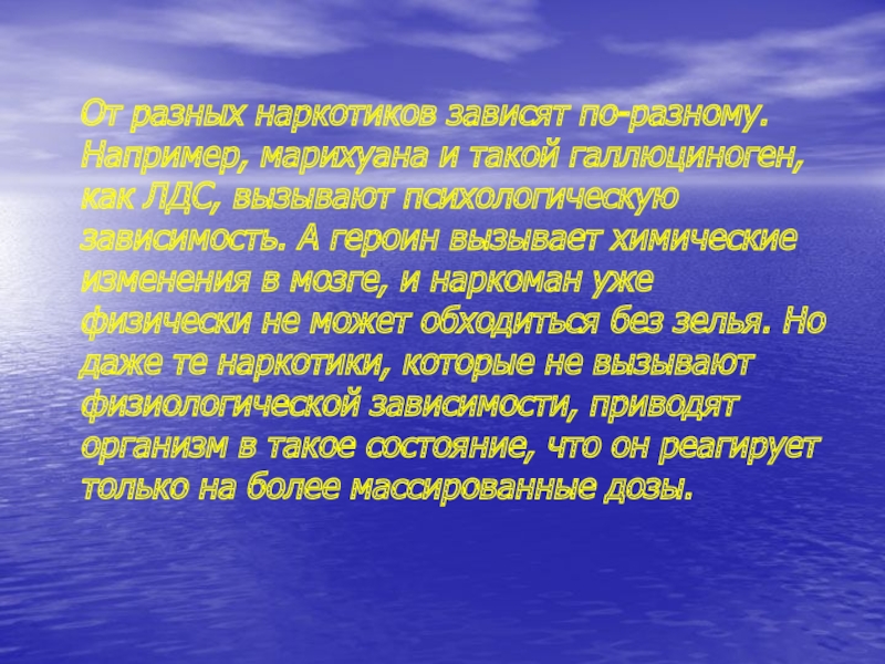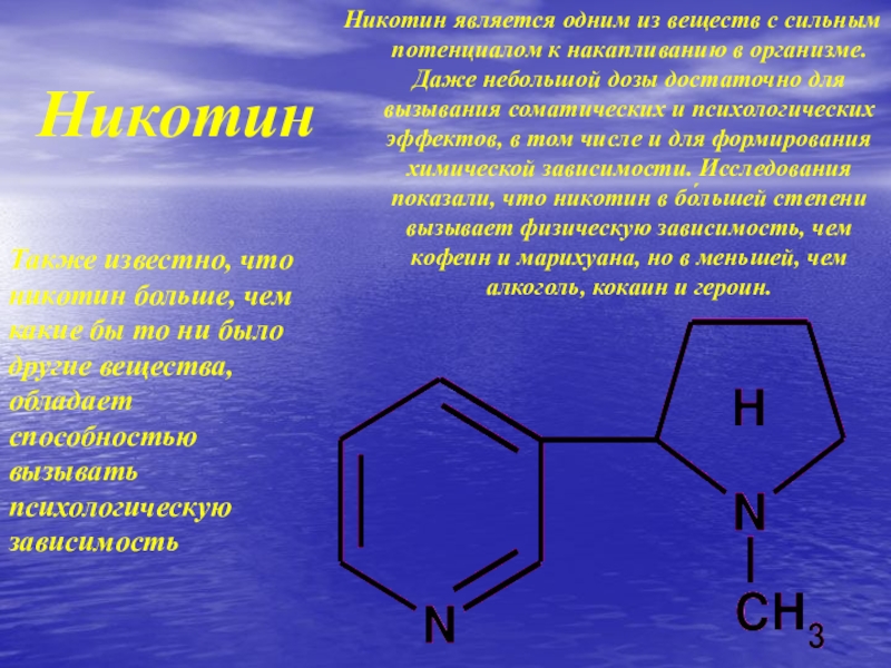 организме. Даже небольшой дозы достаточно для вызывания соматических и психологических эффектов, в том числе и для формирования химической зависимости. Исследования показали, что никотин в бо́льшей степени вызывает физическую зависимость, чем кофеин и марихуана, но в меньшей, чем алкоголь, кокаин и героин.