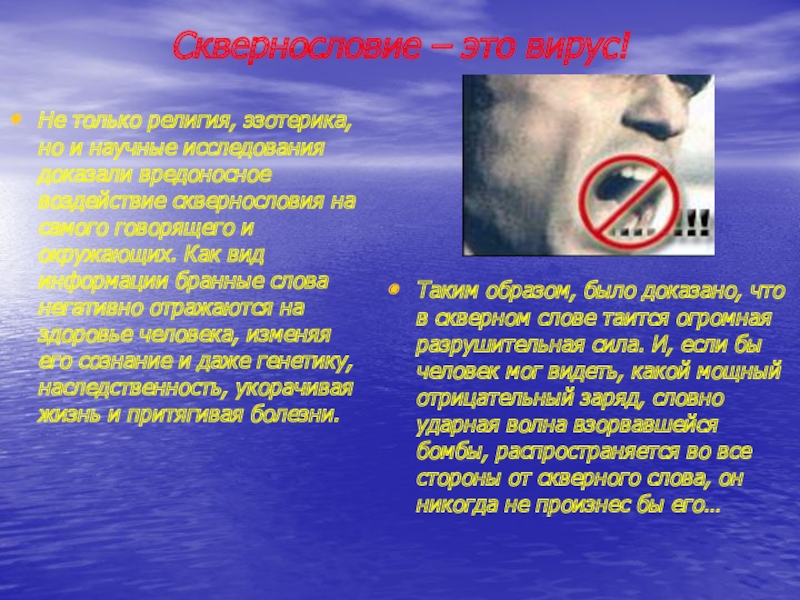 доказали вредоносное воздействие сквернословия на самого говорящего и окружающих. Как вид информации бранные слова негативно отражаются на здоровье человека, изменяя его сознание и даже генетику, наследственность, укорачивая жизнь и притягивая болезни.