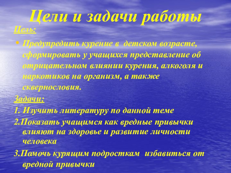 Наша задача предоставить учащимся возможность познакомиться с информацией и статистикой по проблеме курения и алкоголизма. Показать пагубность для малого организма употребление табачных и спиртных изделий, и не только... И в конечном итоге, провести профилактические беседы по данным проблемам.