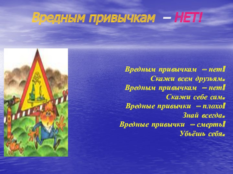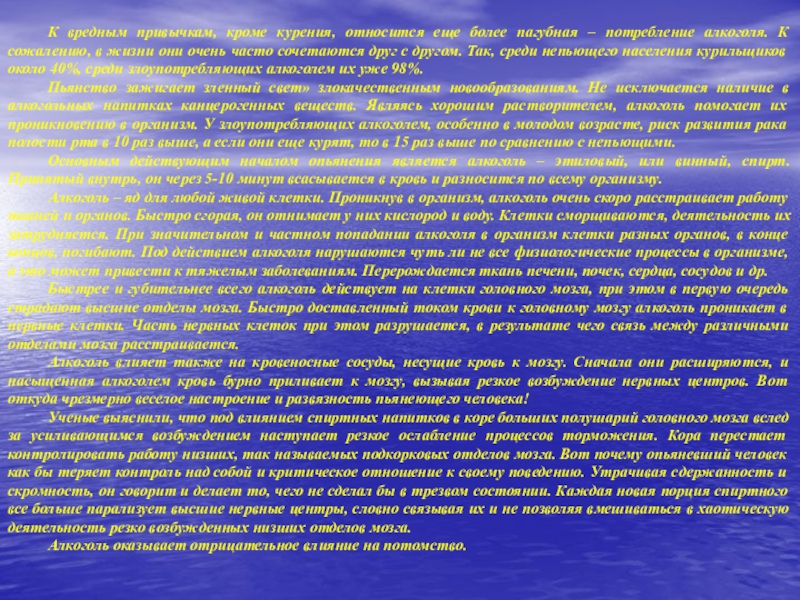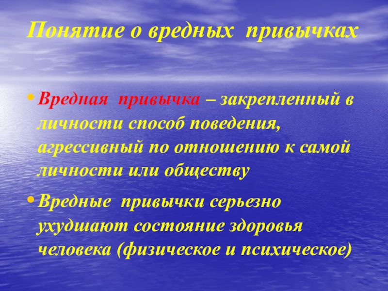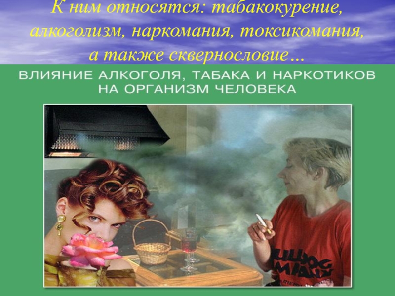 Слайд 7К ним относятся: табакокурение, алкоголизм, наркомания, токсикомания, а также сквернословие…