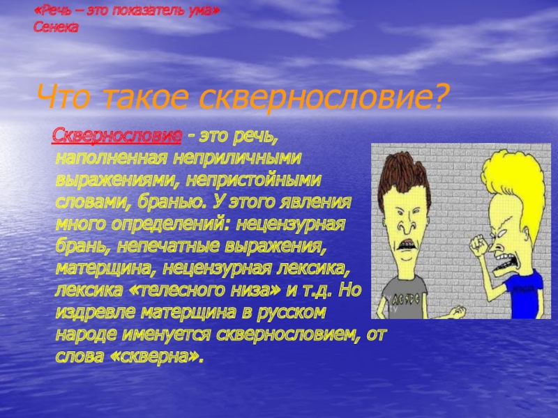 речь, наполненная неприличными выражениями, непристойными словами, бранью. У этого явления много определений: нецензурная брань, непечатные выражения, матерщина, нецензурная лексика, лексика «телесного низа» и т.д. Но издревле матерщина в русском народе именуется сквернословием, от слова «скверна».