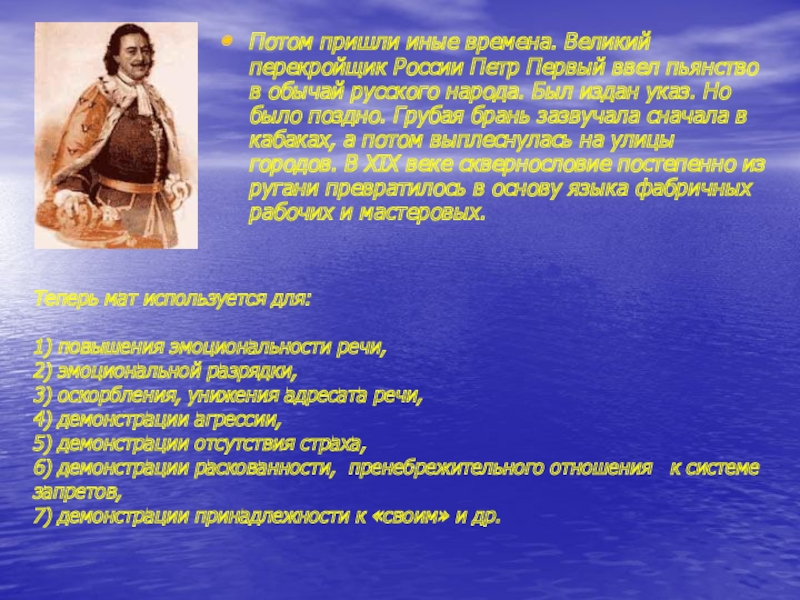 Слайд 148Потом пришли иные времена. Великий перекройщик России Петр Первый ввел пьянство