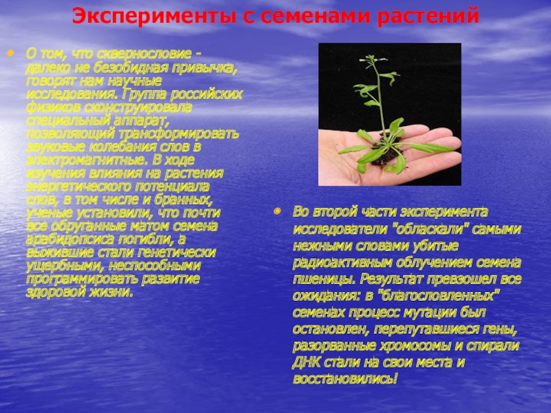 привычка, говорят нам научные исследования. Группа российских физиков сконструировала специальный аппарат, позволяющий трансформировать звуковые колебания слов в электромагнитные. В ходе изучения влияния на растения энергетического потенциала слов, в том числе и бранных, ученые установили, что почти все обруганные матом семена арабидопсиса погибли, а выжившие стали генетически ущербными, неспособными программировать развитие здоровой жизни.