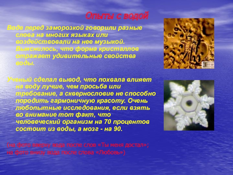 или воздействовали на нее музыкой. Выяснилось, что форма кристаллов отражает удивительные свойства воды.