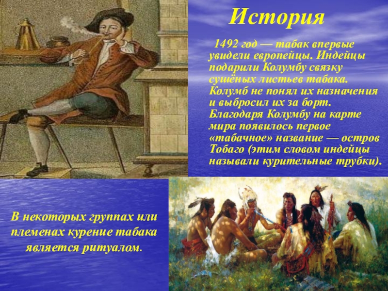 сушёных листьев табака. Колумб не понял их назначения и выбросил их за борт. Благодаря Колумбу на карте мира появилось первое «табачное» название — остров Тобаго (этим словом индейцы называли курительные трубки).