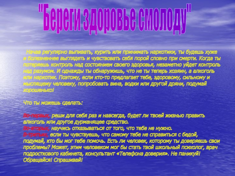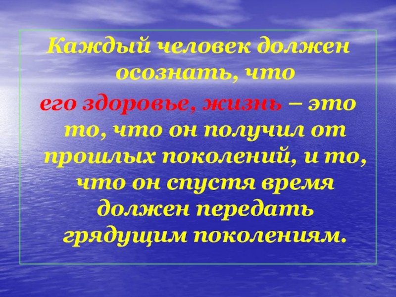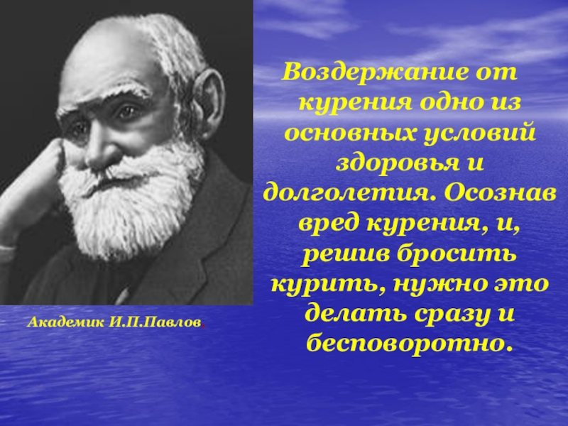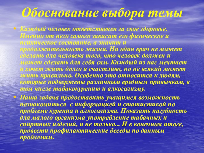 него самого зависит его физическое и психическое состояние, а значит и продолжительность жизни. Ни один врач не может сделать для человека того, что человек должен и может сделать для себя сам. Каждый из нас мечтает и хочет жить долго и счастливо, но не всякий может жить правильно. Особенно это относится к людям, которые подвержены различным вредным привычкам, в том числе табакокурению и алкоголизму.