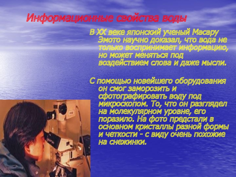 что вода не только воспринимает информацию, но может меняться под воздействием слова и даже мысли.