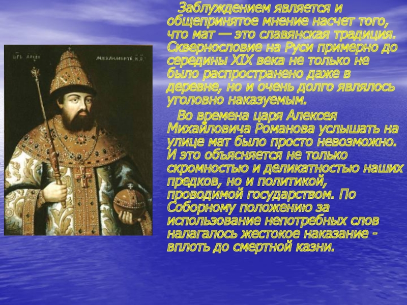 Во времена царя Алексея Михайловича Романова услышать на улице мат было просто невозможно. И это объясняется не только скромностью и деликатностью наших предков, но и политикой, проводимой государством. По Соборному положению за использование непотребных слов налагалось жестокое наказание - вплоть до смертной казни.