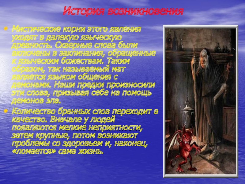 слова были включены в заклинания, обращенные к языческим божествам. Таким образом, так называемый мат является языком общения с демонами. Наши предки произносили эти слова, призывая себе на помощь демонов зла.