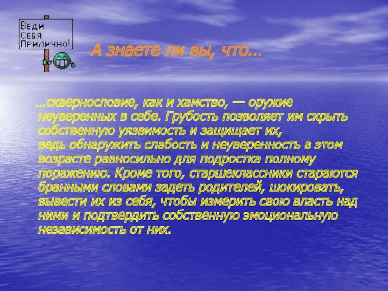 в себе. Грубость позволяет им скрыть собственную уязвимость и защищает их, ведь обнаружить слабость и неуверенность в этом возрасте равносильно для подростка полному поражению. Кроме того, старшеклассники стараются бранными словами задеть родителей, шокировать, вывести их из себя, чтобы измерить свою власть над ними и подтвердить собственную эмоциональную независимость от них.