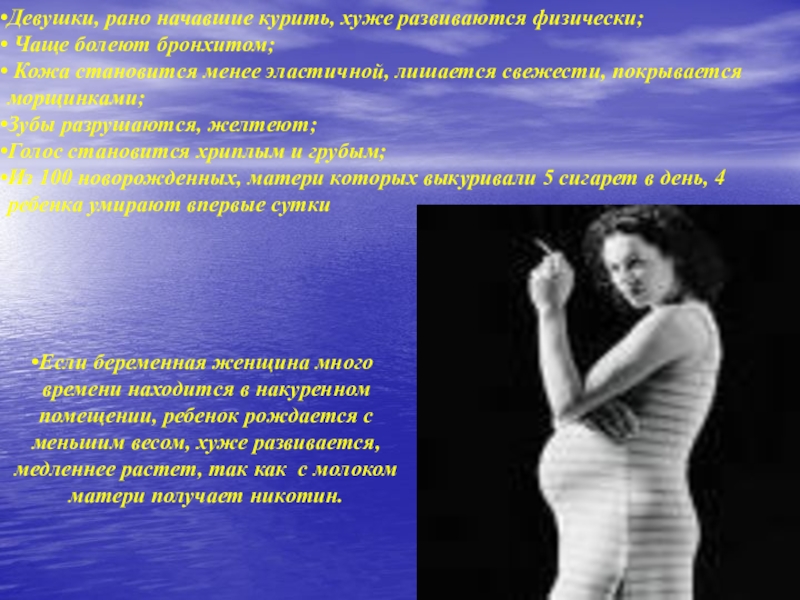 Слайд 25Девушки, рано начавшие курить, хуже развиваются физически;