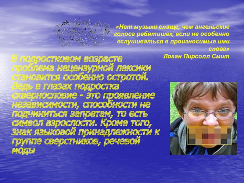 В подростковом возрасте проблема нецензурной лексики становится особенно остротой. Ведь в глазах подростка сквернословие - это проявление независимости, способности не подчиниться запретам, то есть символ взрослости. Кроме того, знак языковой принадлежности к группе сверстников, речевой моды