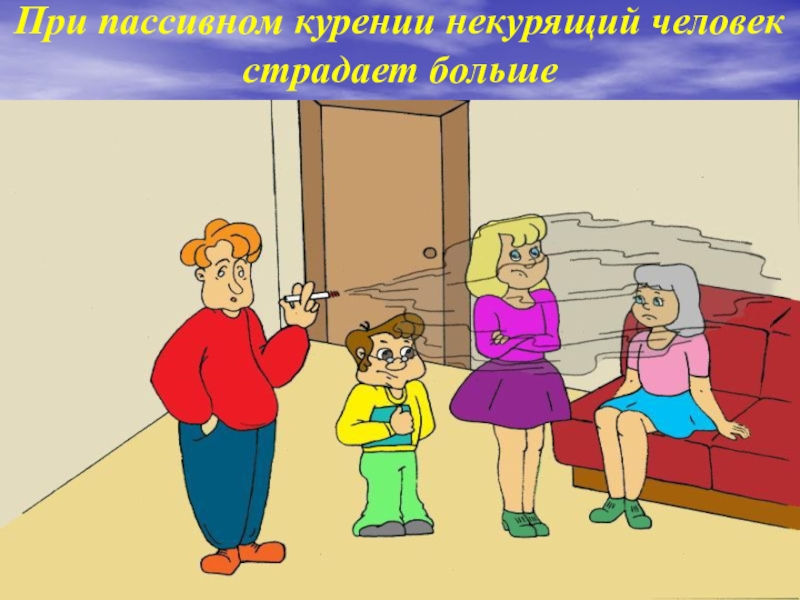 Слайд 16При пассивном курении некурящий человек страдает больше