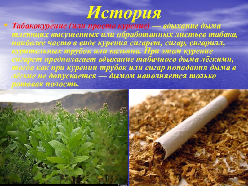 листьев табака, наиболее часто в виде курения сигарет, сигар, сигарилл, курительных трубок или кальяна. При этом курение сигарет предполагает вдыхание табачного дыма лёгкими, тогда как при курении трубок или сигар попадания дыма в лёгкие не допускается — дымом наполняется только ротовая полость.