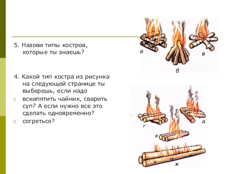 5. Назови типы костров, которые ты знаешь?4. Какой тип костра из рисунка на следующей странице ты выберешь,
