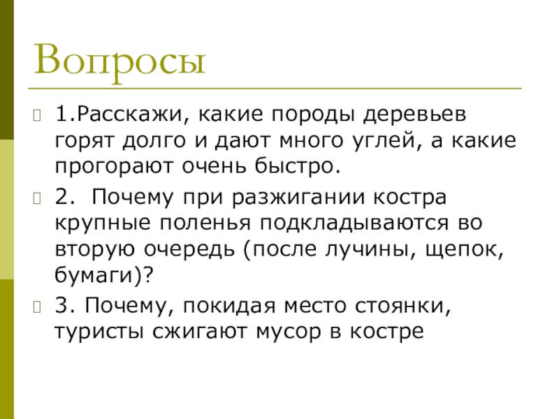 Вопросы1.Расскажи, какие породы деревьев горят долго и дают много углей, а какие прогорают очень быстро.2. Почему при