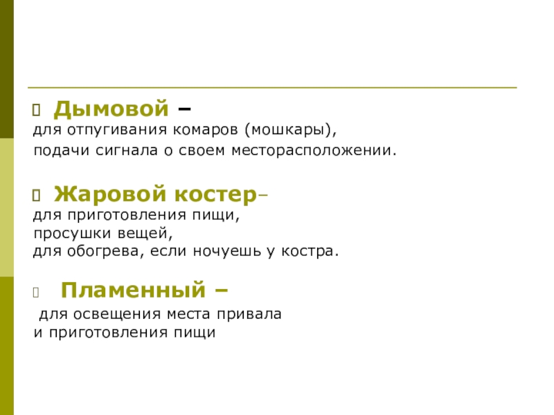 Дымовой – для отпугивания комаров (мошкары), подачи сигнала о своем месторасположении. Жаровой костер–для приготовления пищи, просушки вещей,