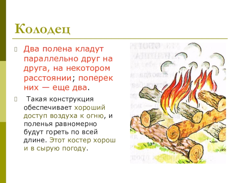 Колодец Два полена кладут параллельно друг на друга, на некотором расстоянии; поперек них — еще два. Такая