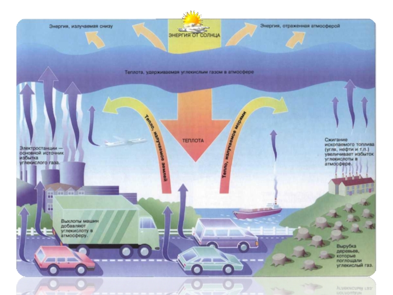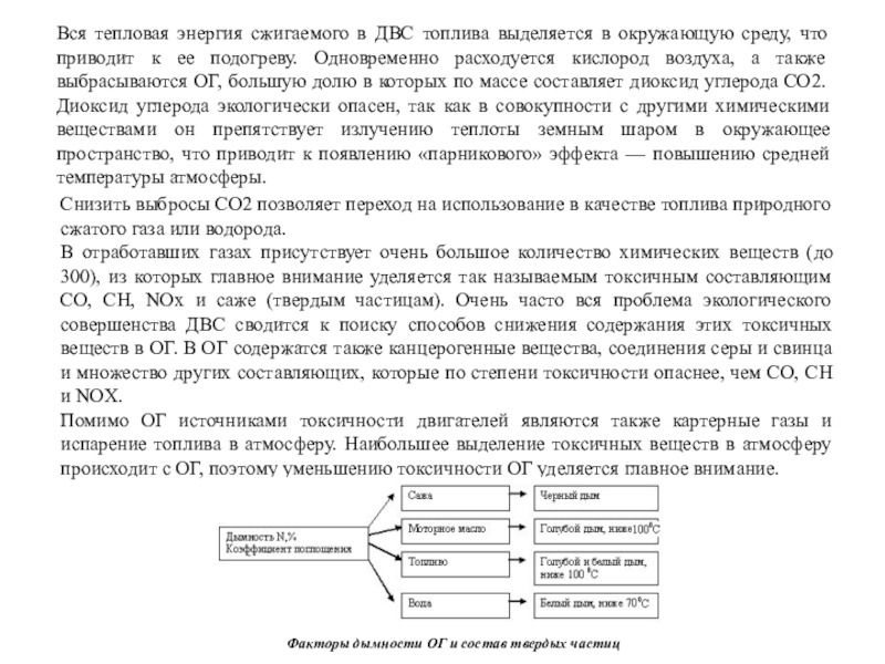 что приводит к ее подогреву. Одновременно расходуется кислород воздуха, а также выбрасываются ОГ, большую долю в которых по массе составляет диоксид углерода CO2. Диоксид углерода экологически опасен, так как в совокупности с другими химическими веществами он препятствует излучению теплоты земным шаром в окружающее пространство, что приводит к появлению «парникового» эффекта — повышению средней температуры атмосферы.