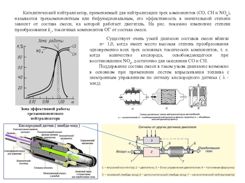 СН и NOх), называется трехкомпонентным или бифункциональным, его эффективность в значительной степени зависит от состава смеси, на которой работает двигатель. На рис. показано изменение степени преобразования ki , токсичных компонентов ОГ от состава смеси.