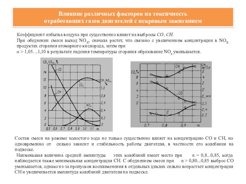 Наименьшая величина средней амплитуды этих колебаний имеет место при α = 0,8...0,85, когда наблюдается также минимальная концентрация СН. С обеднением смеси при α > 0,80...0,85 выброс СО уменьшается, однако из-за пропусков воспламенения в отдельных циклах сильно возрастает концентрация СН и увеличивается амплитуда колебаний двигателя на подвеске.