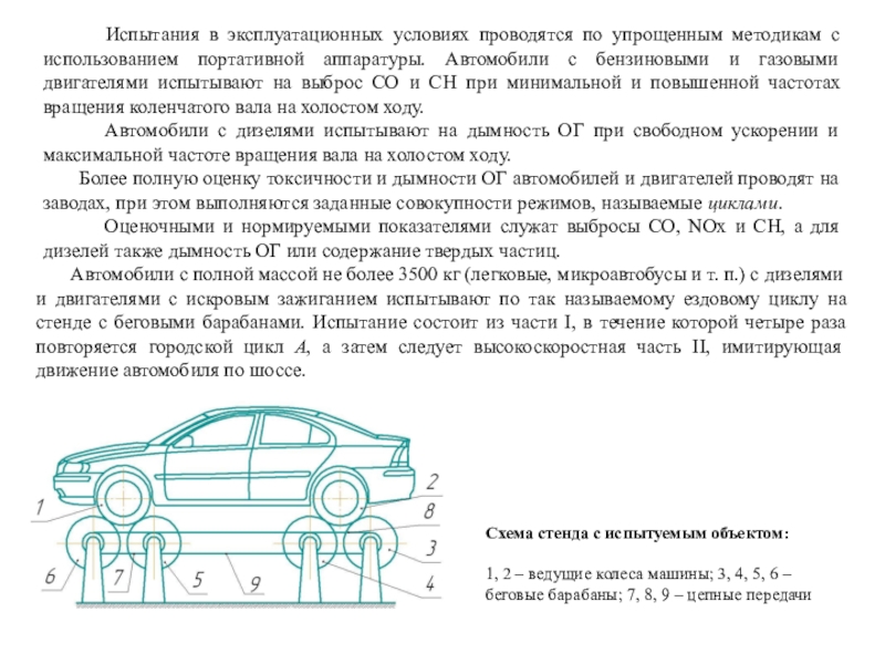 Автомобили с полной массой не более 3500 кг (легковые, микроавтобусы и т. п.) с дизелями и двигателями с искровым зажиганием испытывают по так называемому ездовому циклу на стенде с беговыми барабанами. Испытание состоит из части I, в течение которой четыре раза повторяется городской цикл А, а затем следует высокоскоростная часть II, имитирующая движение автомобиля по шоссе.