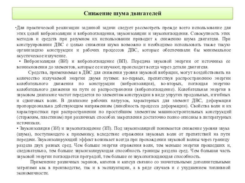 использование для этих целей виброизоляции и вибропоглощения, звукоизоляции и звукопоглощения. Совокупность этих методов и средств при разумном их использовании приводит к снижению шума двигателя. При конструировании ДВС с целью снижения шума возможно и необходимо использовать также такую организацию конструкции и рабочих процессов ДВС, которые обеспечивали бы минимальное акустическое излучение.