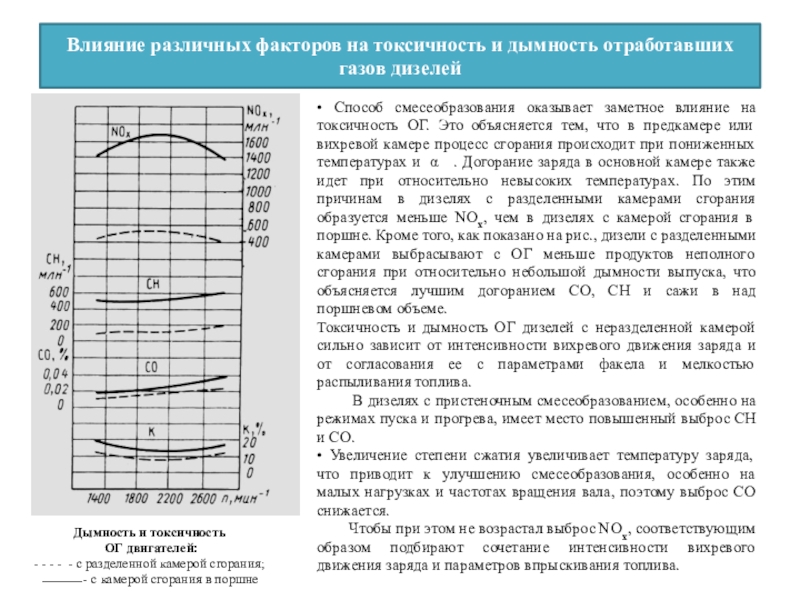 Слайд 18Влияние различных факторов на токсичность и дымность отработавших газов дизелей