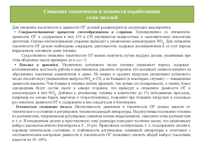Для снижения токсичности ОГ рекомендуется использовать следующие мероприятия.