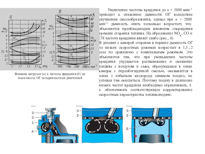 мин-1 приводит к снижению дымности ОГ вследствие улучшения смесеобразования, однако при n > 2000 мин-1 дымность опять несколько возрастает, что объясняется преобладающим влиянием сокращения времени сгорания топлива. На образование NОх, СО и СН частота вращения влияет слабо (рис., б).