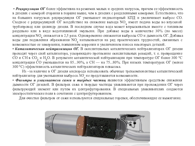 • Каталитическая нейтрализация ОГ. В окислительных каталитических нейтрализаторах ОГ дизеля проходят через слой катализатора, ускоряющего протекание окислительных реакций, т. е. превращение СО и СН в СО2 и Н2О. В результате каталитической нейтрализации при температуре ОГ более 300 °С концентрация СО уменьшается на 85...90%, а СН — на 75...80%. При низких температурах ОГ (менее 300 °С) эффективность каталитических нейтрализаторов невысока.