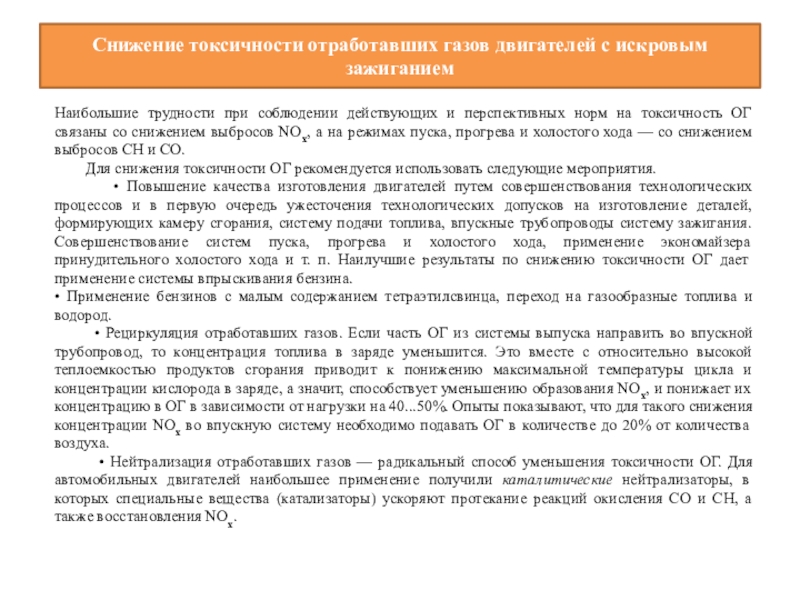 • Нейтрализация отработавших газов — радикальный способ уменьшения токсичности ОГ. Для автомобильных двигателей наибольшее применение получили каталитические нейтрализаторы, в которых специальные вещества (катализаторы) ускоряют протекание реакций окисления СО и СН, а также восстановления NOх.