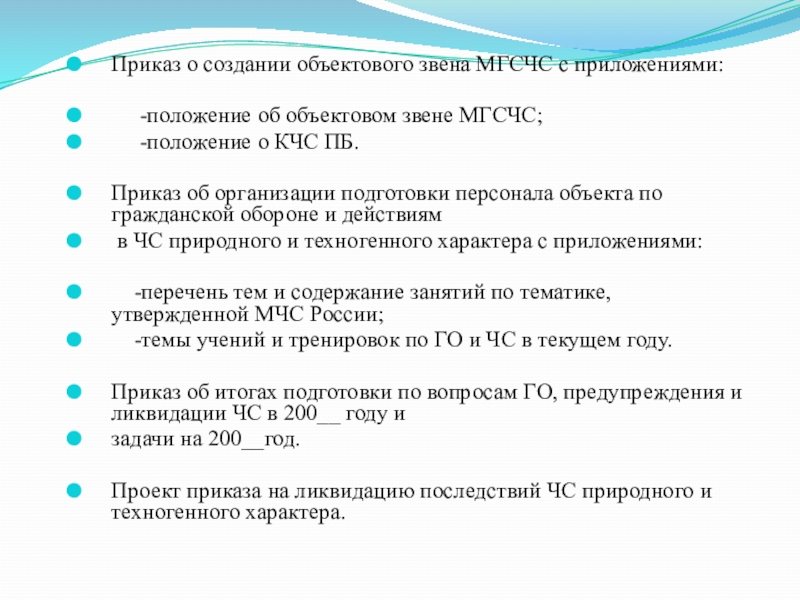 Приказ о создании объектового звена МГСЧС с приложениями: