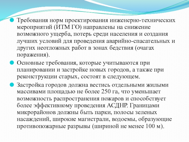 Слайд 5Требования норм проектирования инженерно-технических мероприятий (ИТМ ГО) направлены на снижение возможного