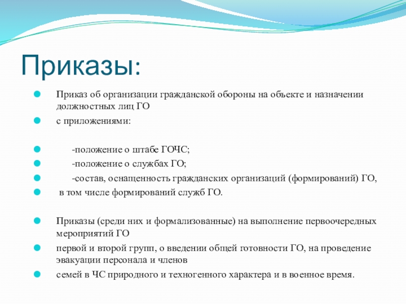 Приказы (среди них и формализованные) на выполнение первоочередных мероприятий ГО