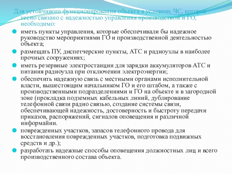 Для устойчивого функционирования объекта в условиях ЧС, которое тесно связано с