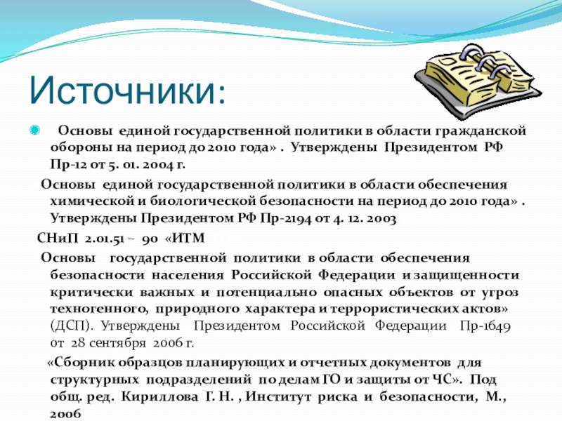 «Основы единой государственной политики в области обеспечения химической и биологической безопасности на период до 2010 года» . Утверждены Президентом РФ Пр-2194 от 4. 12. 2003 г.