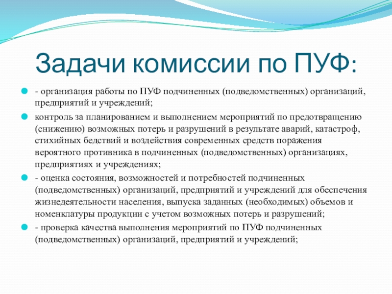 - проверка качества выполнения мероприятий по ПУФ подчиненных (подведомственных) организаций, предприятий и учреждений;
