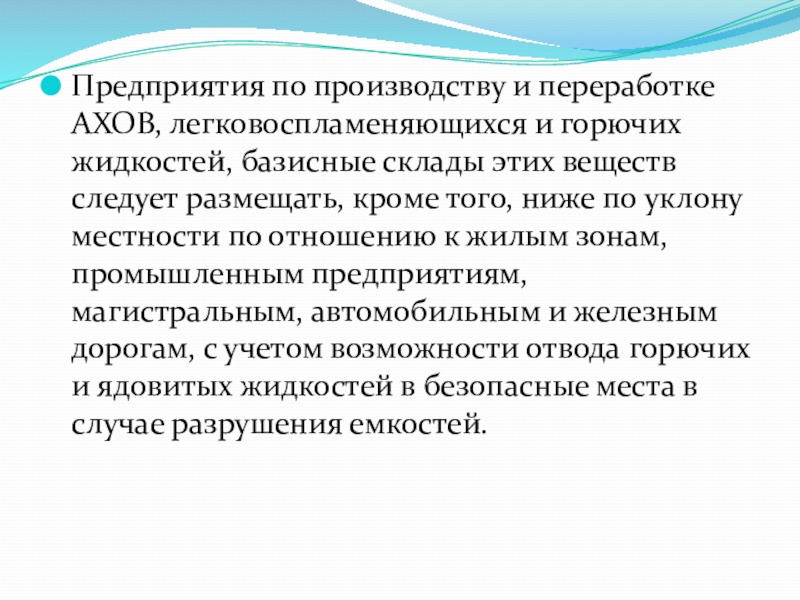 склады этих веществ следует размещать, кроме того, ниже по уклону местности по отношению к жилым зонам, промышленным предприятиям, магистральным, автомобильным и железным дорогам, с учетом возможности отвода горючих и ядовитых жидкостей в безопасные места в случае разрушения емкостей.