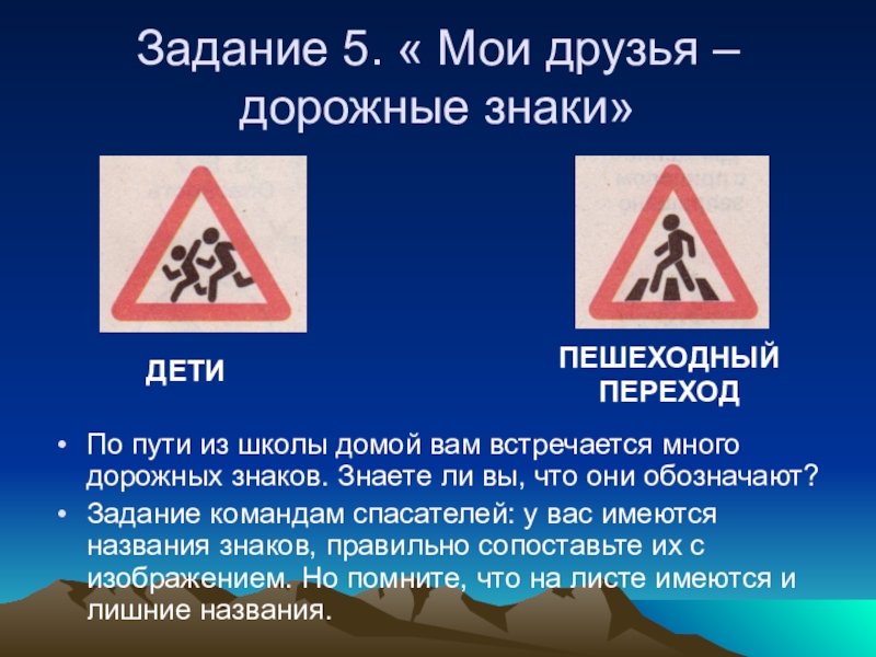 Слайд 17Задание 5. « Мои друзья – дорожные знаки»