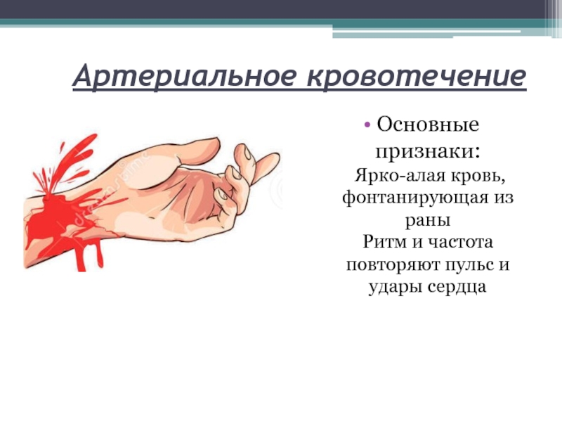 Артериальное кровотечениеОсновные признаки:  Ярко-алая кровь, фонтанирующая из раны Ритм и частота повторяют пульс и удары сердца