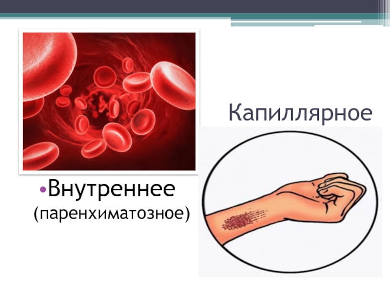 Капиллярное кровотечениеОсновные признаки:  Кровьимеет ярко-алый цвет. Интенсивность такого кровотечения минимальна При таком кровотечении не будет выявляться