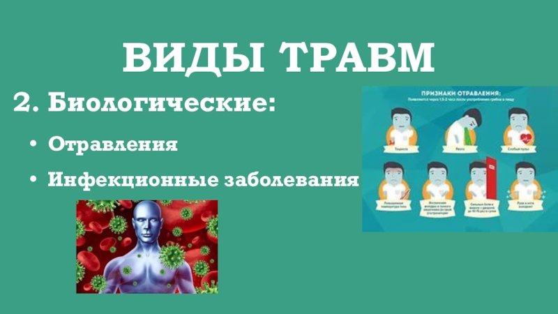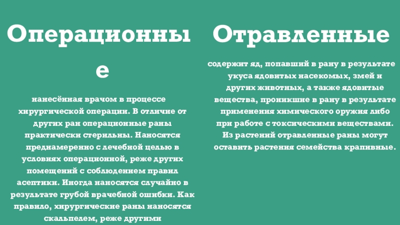 содержит яд, попавший в рану в результате укуса ядовитых насекомых, змей и других животных, а также ядовитые вещества, проникшие в рану в результате применения химического оружия либо при работе с токсическими веществами. Из растений отравленные раны могут оставить растения семейства крапивные.