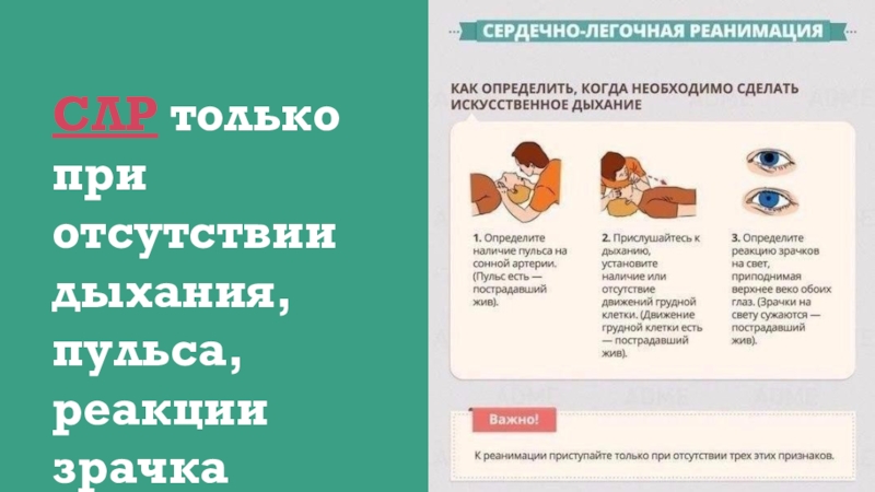Слайд 13СЛР только при отсутствии дыхания, пульса, реакции зрачка