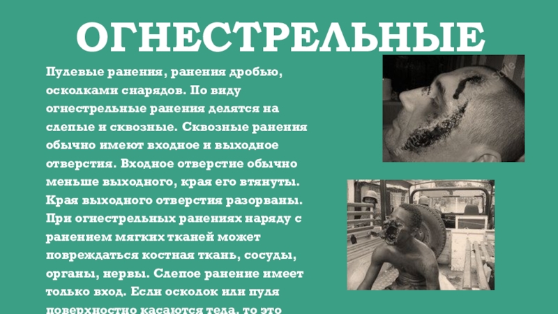 Пулевые ранения, ранения дробью, осколками снарядов. По виду огнестрельные ранения