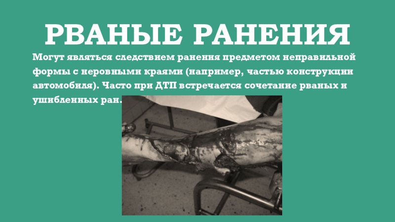 краями (например, частью конструкции автомобиля). Часто при ДТП встречается сочетание рваных и ушибленных ран.